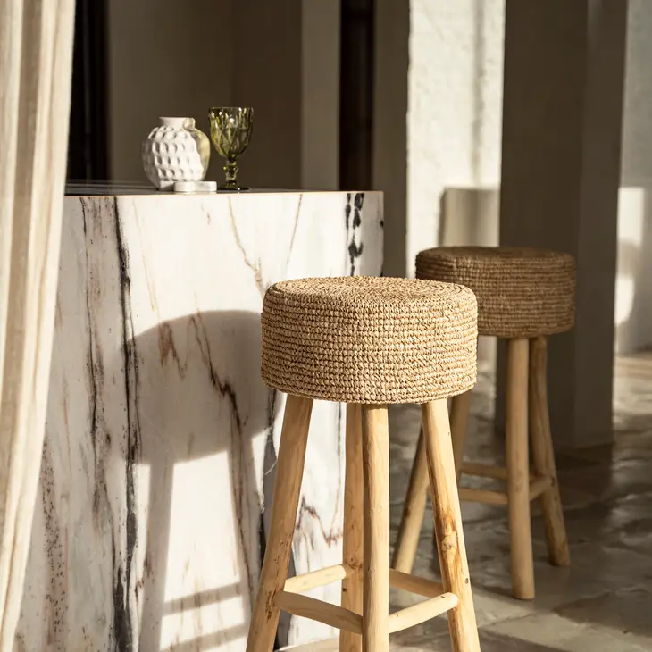 Associant le bois de teck durable au charme terreux du raphia, ce tabouret de bar est un véritable gagnant. Il est doté d’un cadre robuste fabriqué à partir de branches de teck, ce qui permet au produit de rester stable et robuste. Le siège est fabriqué en raphia tissé à la main, connu pour son confort et sa texture unique. Il confère à ce tabouret de bar un aspect tactile et accueillant. Apportez une touche d’extérieur à votre maison tout en faisant un choix durable. Faites de votre cuisine ou de votre bar un espace accueillant et élégant avec le tabouret de bar Raffia dès aujourd’hui !