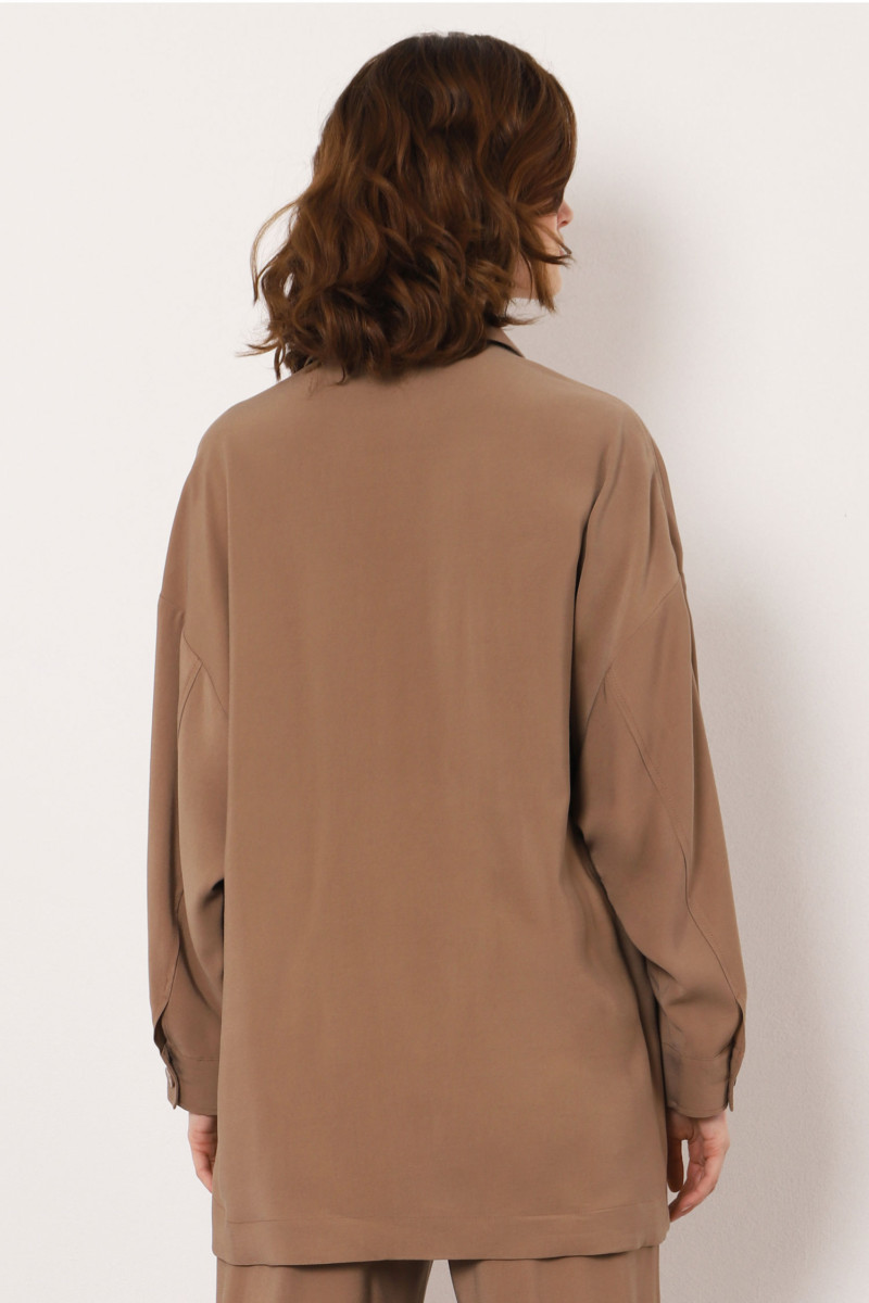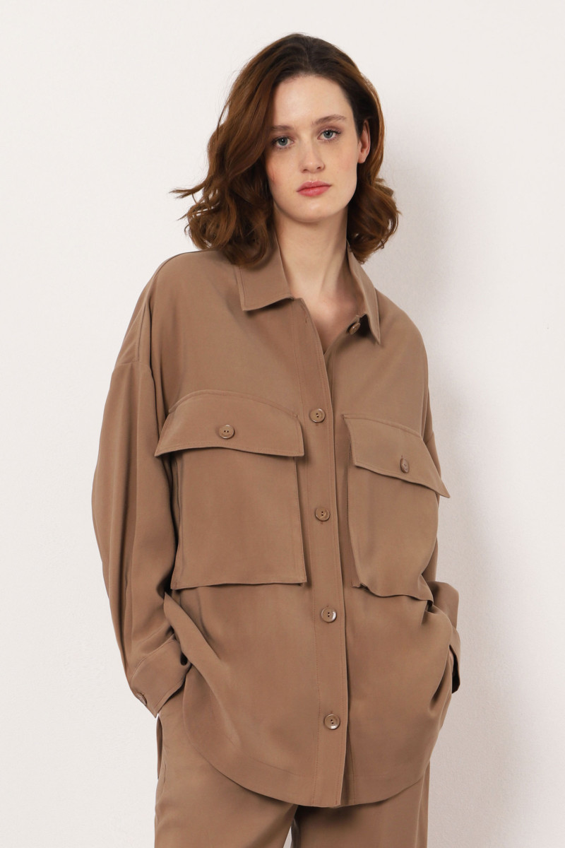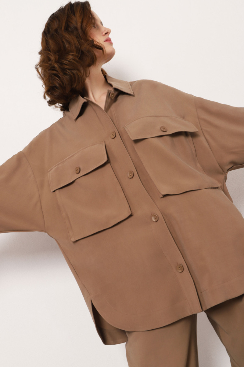 Cette veste style chemise oversize se caractérise par un col, une fermeture à boutons, des manches longues, des emmanchures basses et deux maxi-poches poitrine à rabat boutonné. 89 % viscose, 11 % polyester