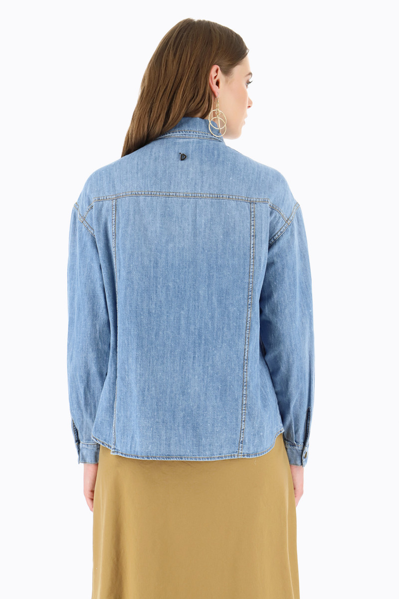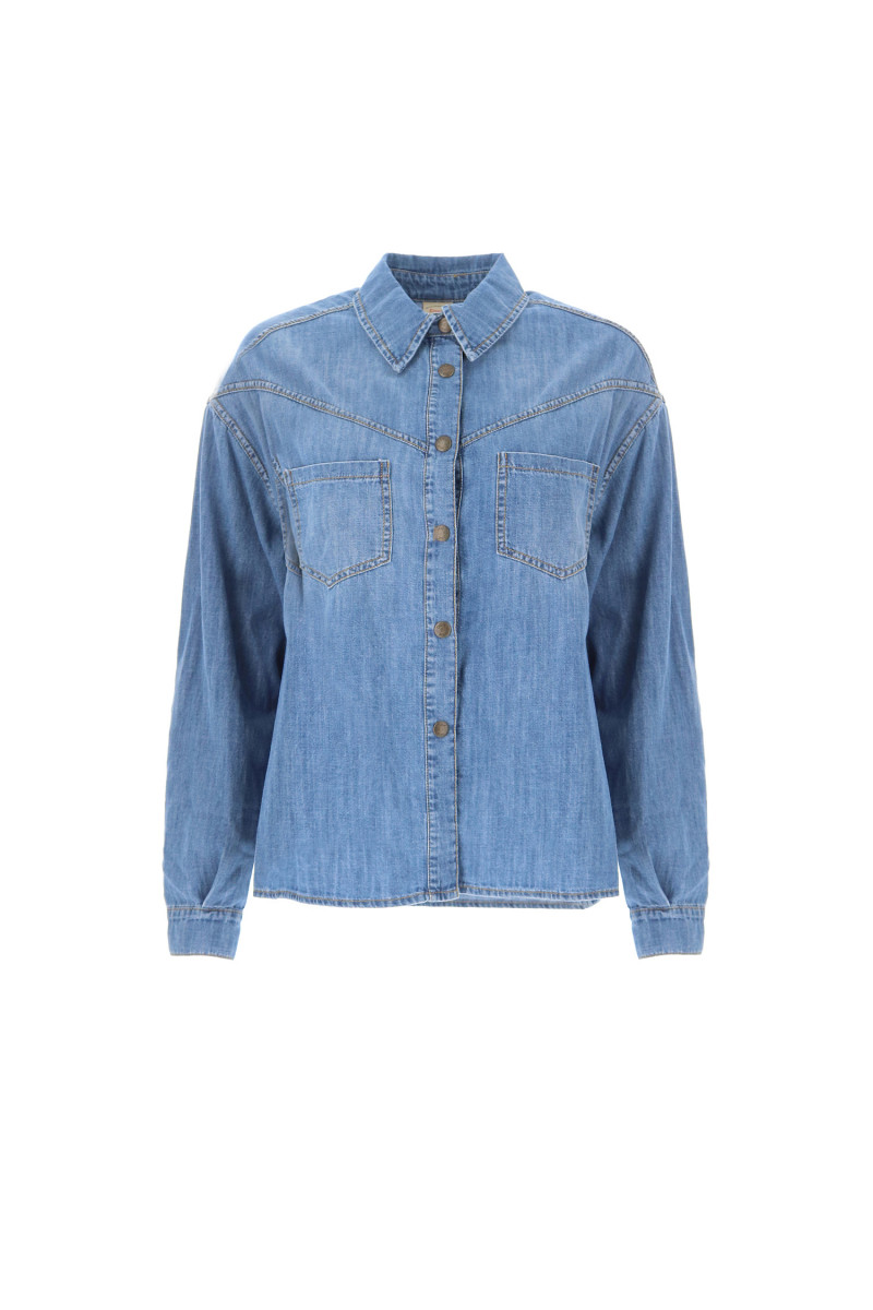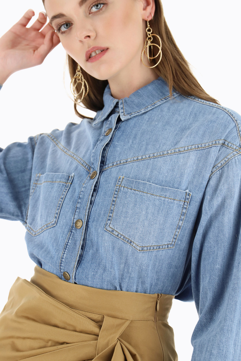 Cette chemise en jean avec col et poches poitrine symétriques présente des manches tombantes terminées par une manchette et des coutures décoratives sur la poitrine ainsi que les épaules.