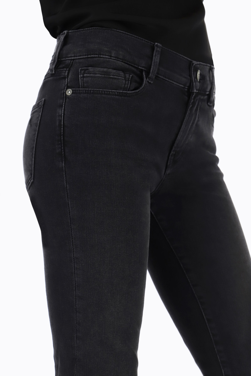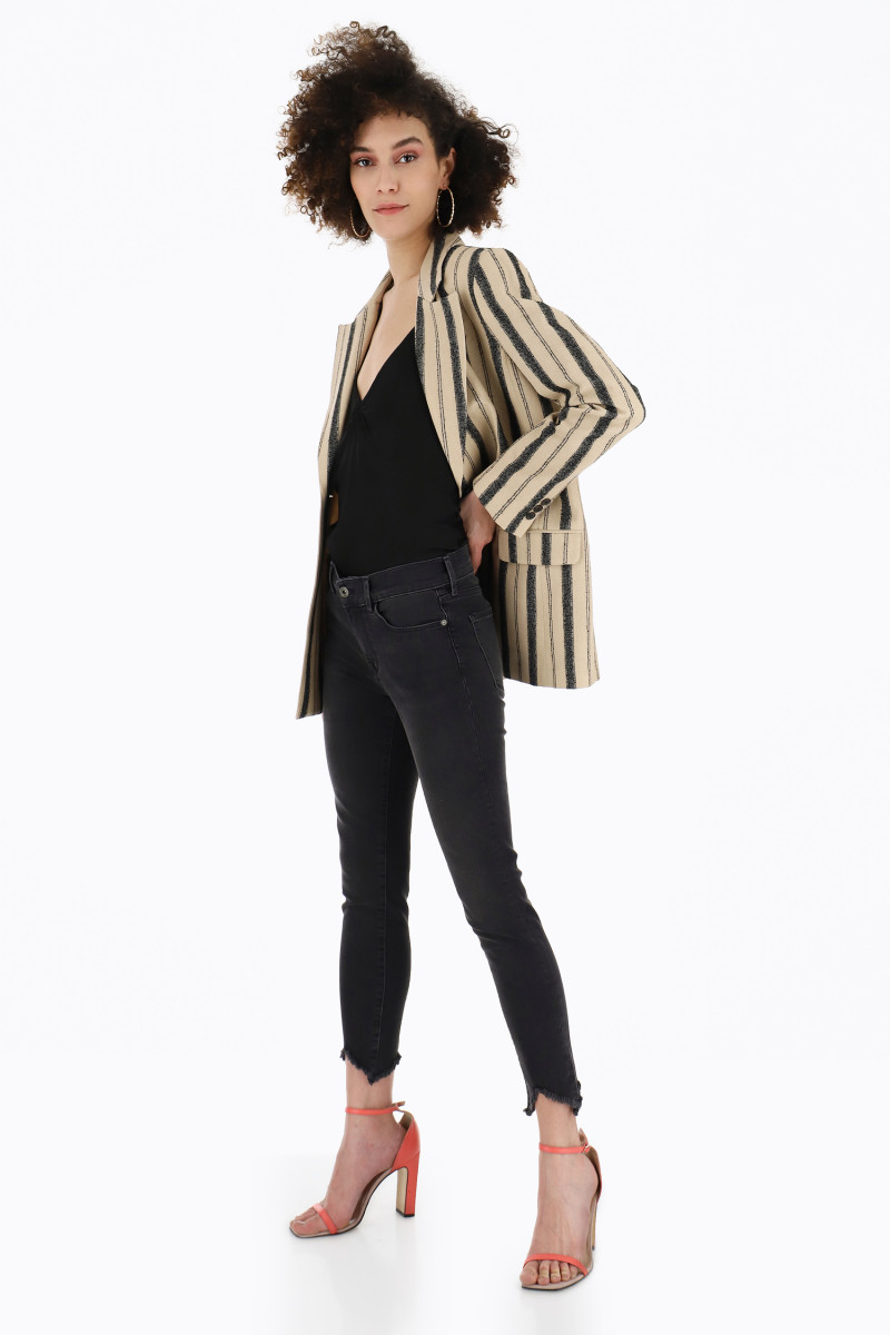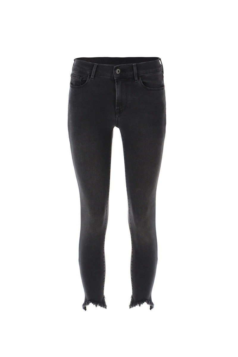 Ce jean skinny à taille mi-haute se caractérise par des ourlets asymétriques à bord franc.