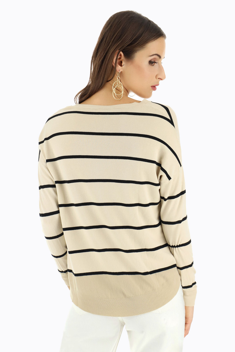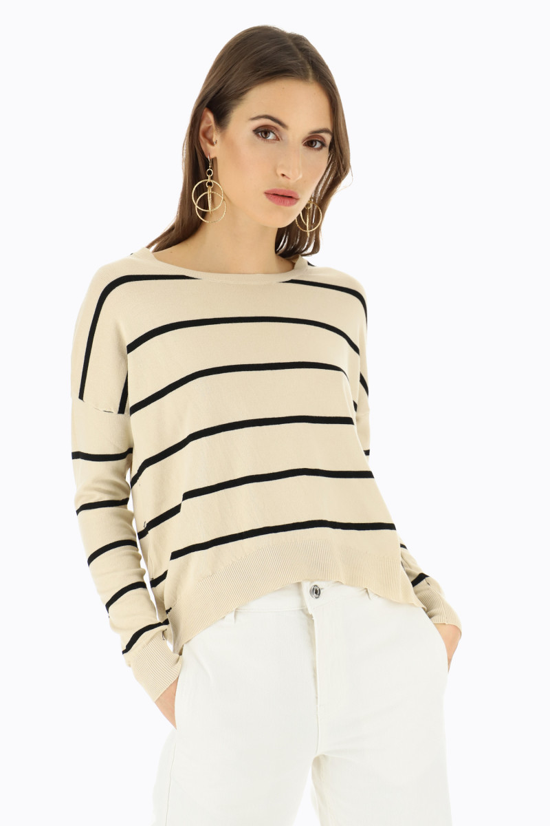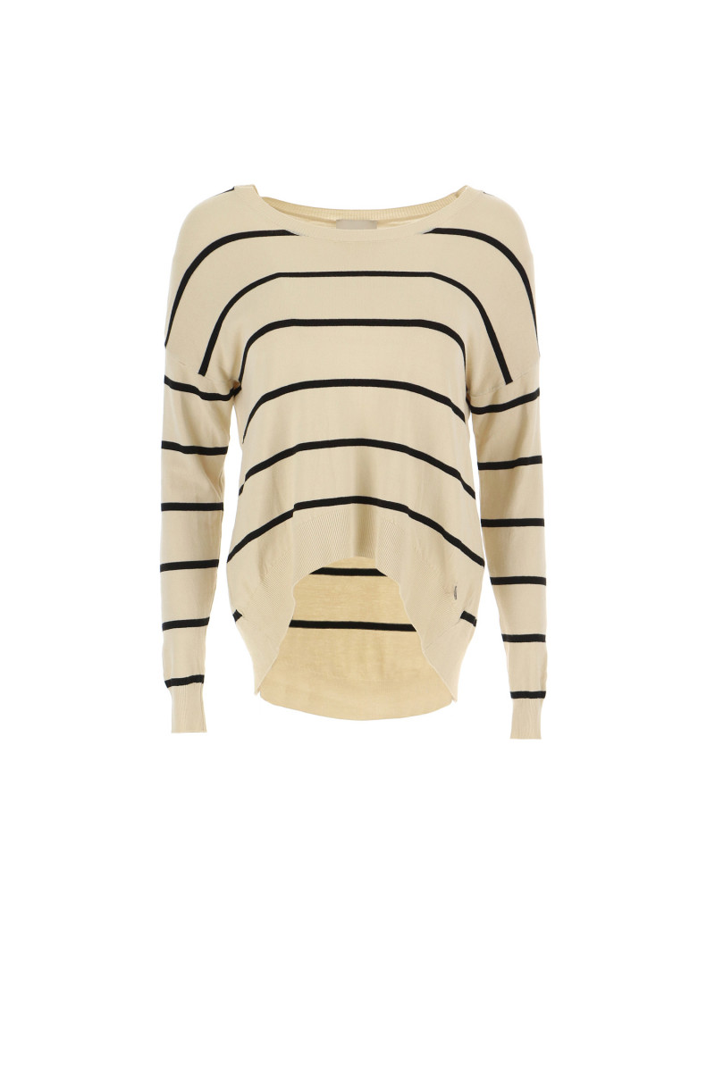 Ce pull-over à rayures manches tombantes se caractérise par une encolure ronde et un ourlet arrondi asymétrique sur le bas.
