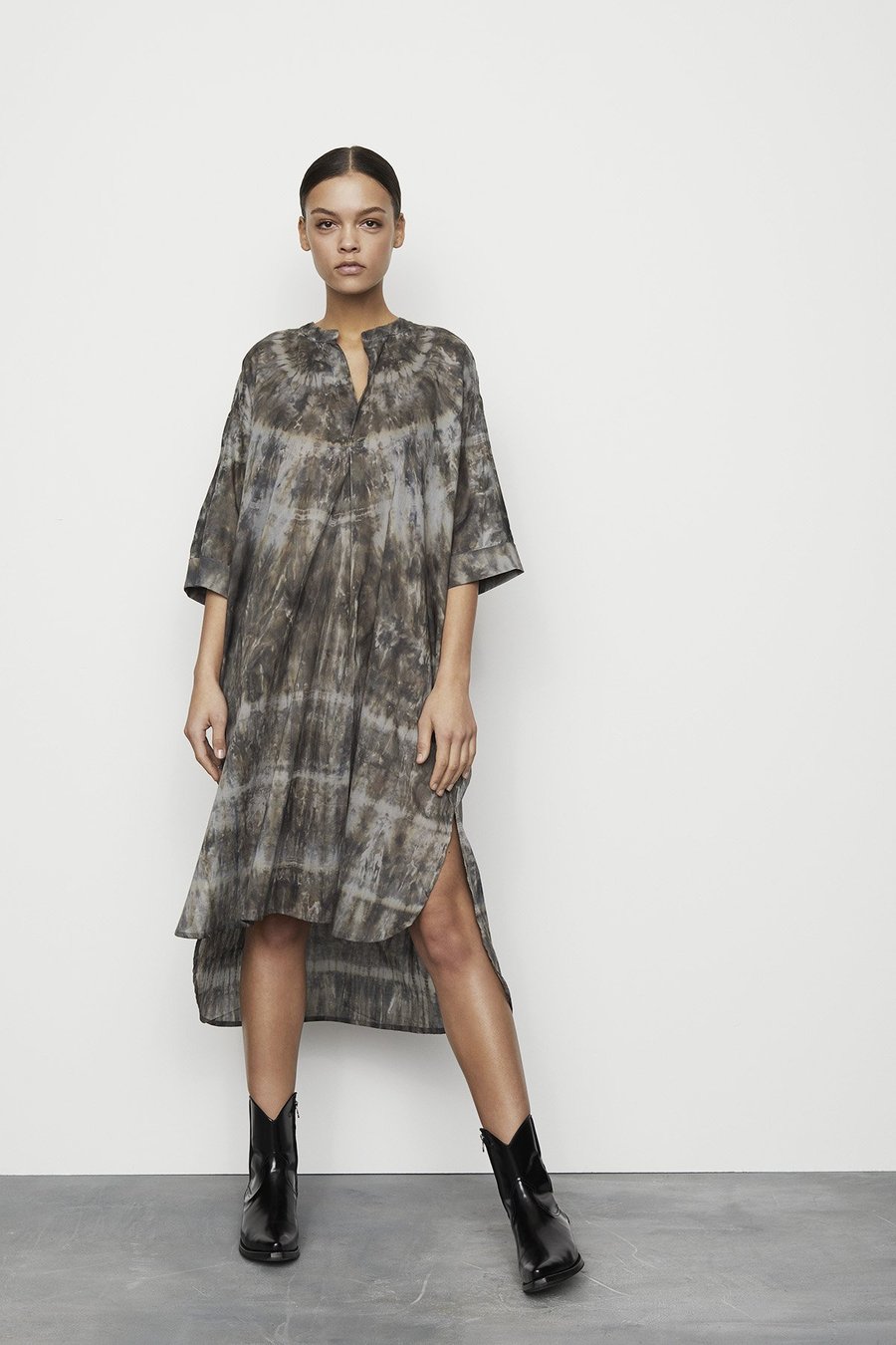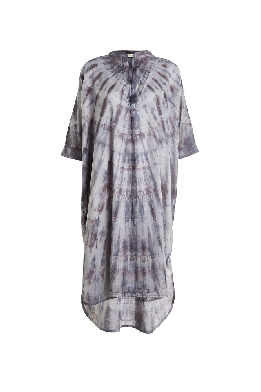 Dans un saisissant tie-dye fabriqué à la main en Indonésie, la robe mi-longue est définie par une coupe décontractée et oversize avec un col ouvert, des manches courtes et un ourlet rond.
