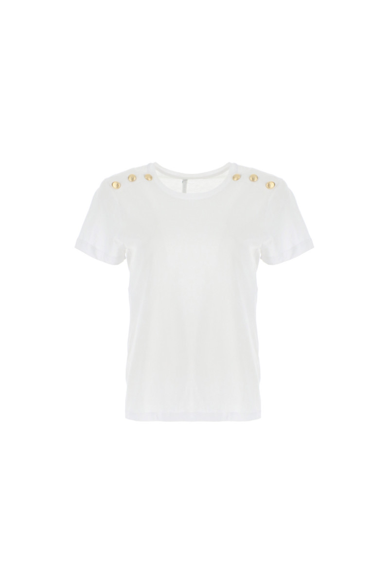 Ce T-shirt à col rond et manches courtes se caractérise par des boutons bijoux sur les épaules.