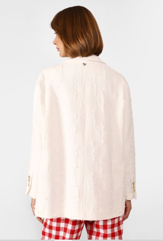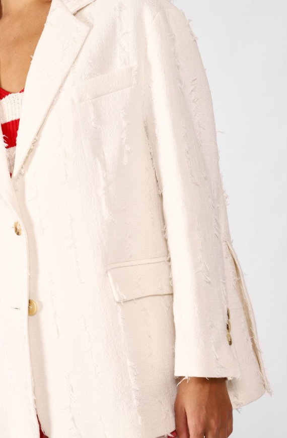 Cette veste unie à boutonnage simple se caractérise par des revers classiques, une poche poitrine passepoilée, des poches passepoilées à rabat et un effet effrangé.